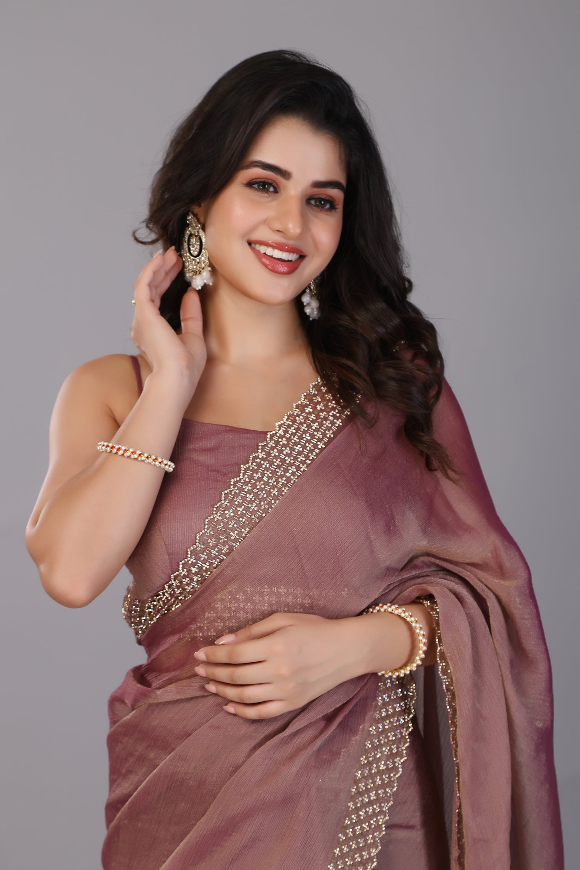 Brown saree in chiffon fabric. The saree is elevated with stone work. It's comes with unstitched blouse. A reflection of kiyaa,s dedication to charm, comfort, and flawless quality.